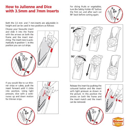 Made in Germany. Set includes: Tough ABS plastic frame with slip resistant rubber feet, Food Safety Holder, 3 inserts (7mm & 3.5mm blades, thick/thin plane slice insert) Blade insert holder