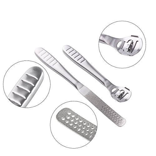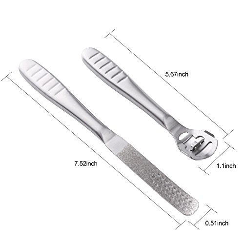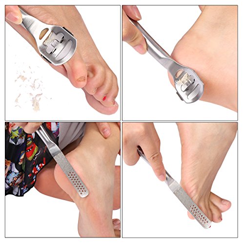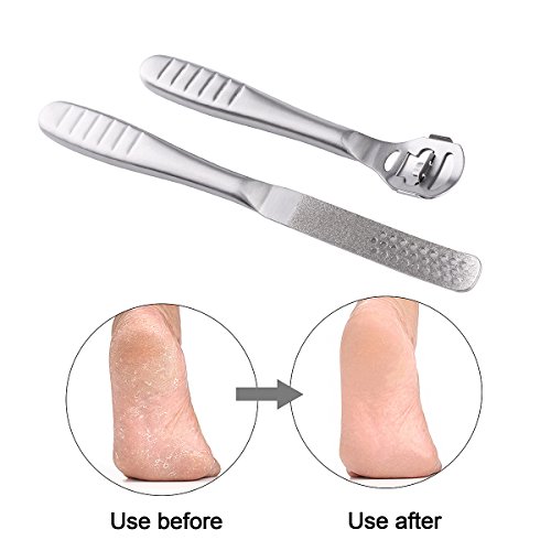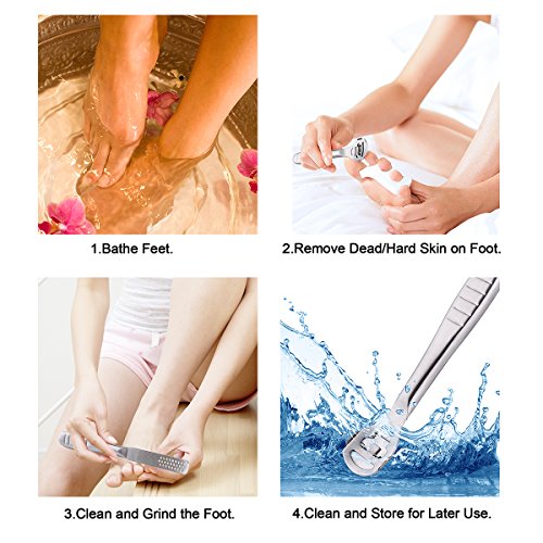 User Guide: 1. Bathe your feet in warm water for 15-30 minutes till the callus becomes soft. 2. Dry the feet, and place the blade edge at the bottom of the callus or dead skin, then pull the callus remover up, then repeat it again till the callus is removed completely. 3. After removing the callus or dead skin, use the foot file to clean and grind the foot to make the skin delicate and smooth.
