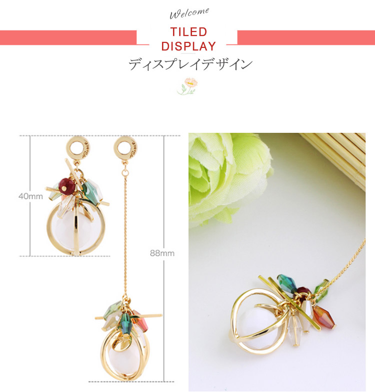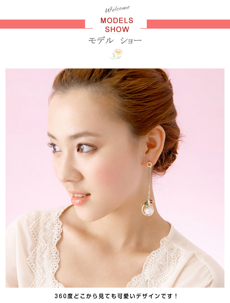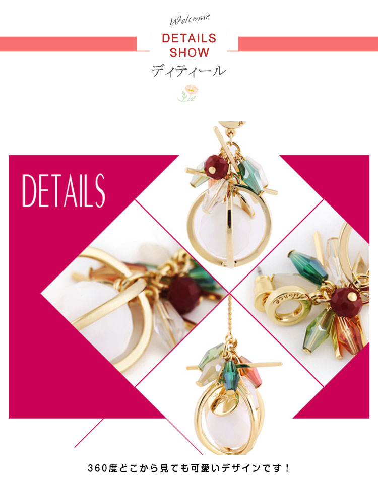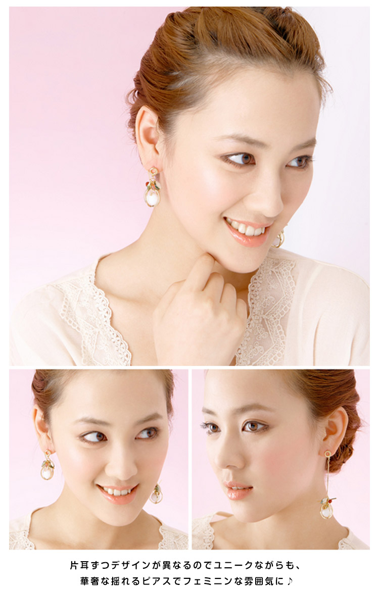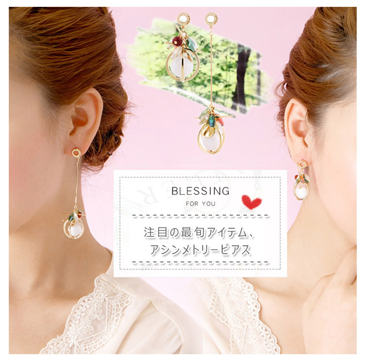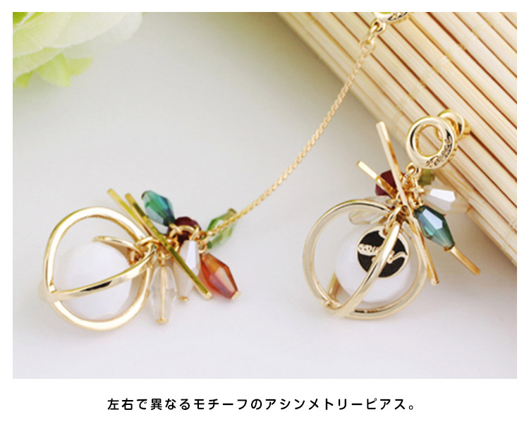 | 注目の最旬アイテム、アシンメトリーピアス。360度どこから見ても可愛いデザインです!片耳ずつデザインが異なるのでユニークながらも、華奢な揺れるピアスでフェミニンな雰囲気に♪ | |