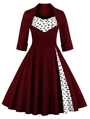 KILOLONE Women 50s Vintage Classic 3/4 Sleeve Bodycon Evening Bridesmaid Dress, Wine/Bow, S