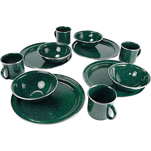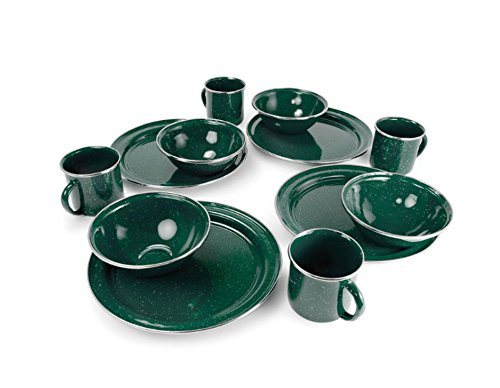 Studio : GSI Outdoors Publisher : GSI Outdoors Product Description Enamelware blends old-fashioned charm and functionality into one sturdy package. The GSI Outdoors Pioneer Blue Enamelware Table Set is built from heavy-gauge steel with a classic speckled enamel finish, every piece has been kiln-hardened twice at 1400° F to stand up to scratches and chipping. Plus, three-ply construction maximizes heat distribution for even cooking. Stainless steel edging protects rims from chipping. Enduring steel construction is dishwasher safe and perfectly suited to both indoor and outdoor use. 0