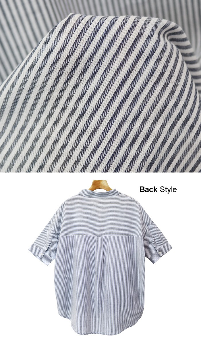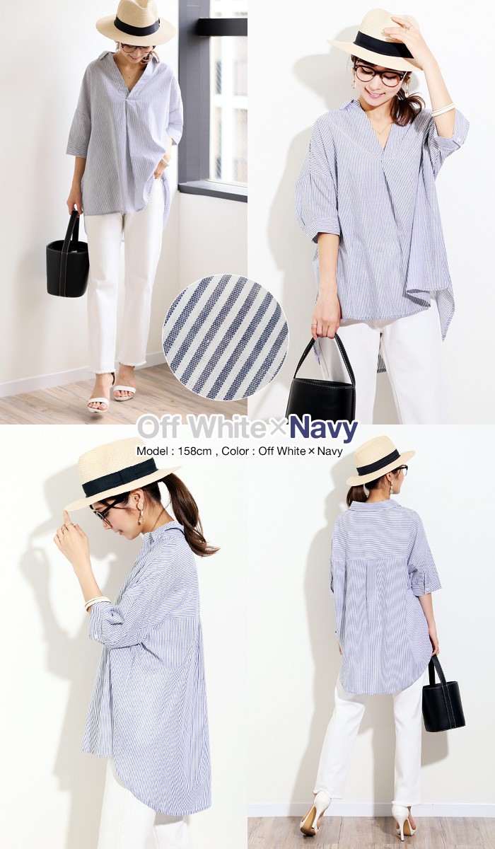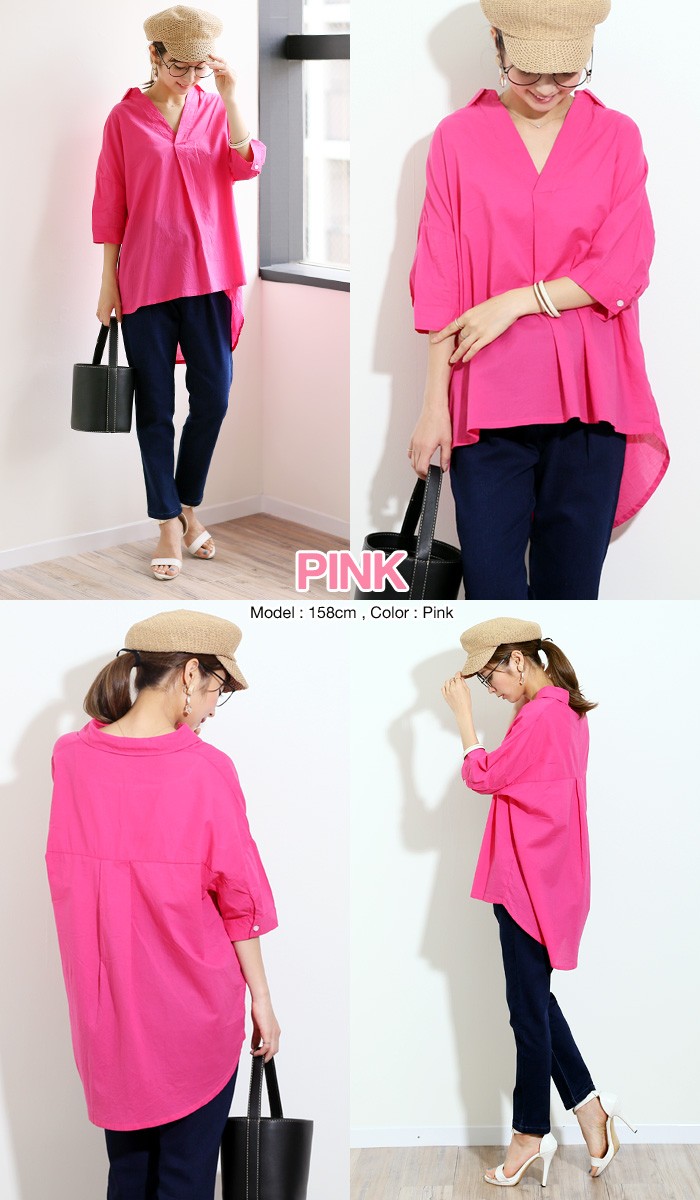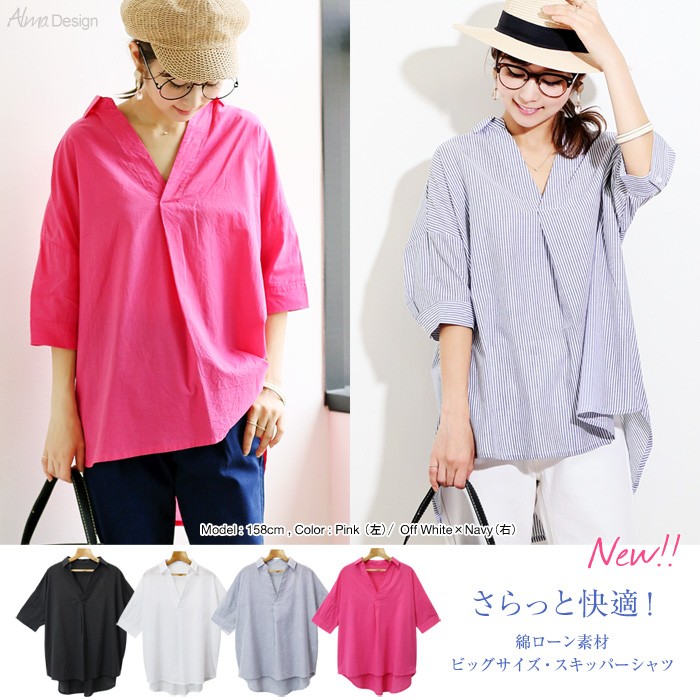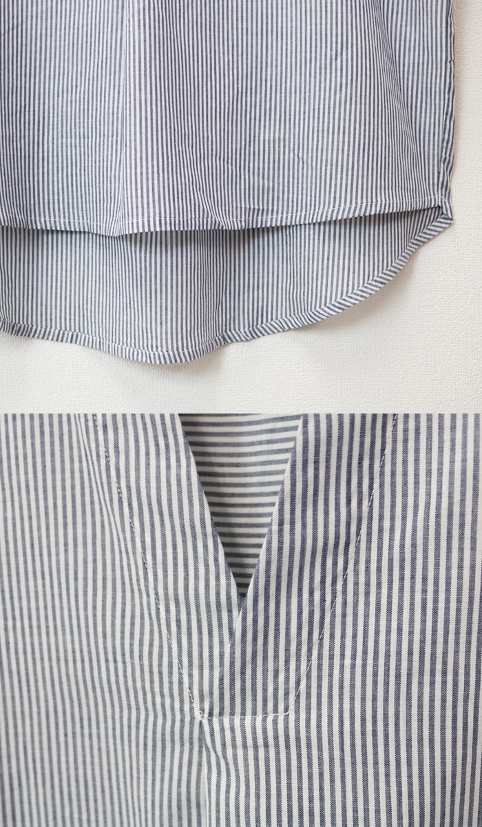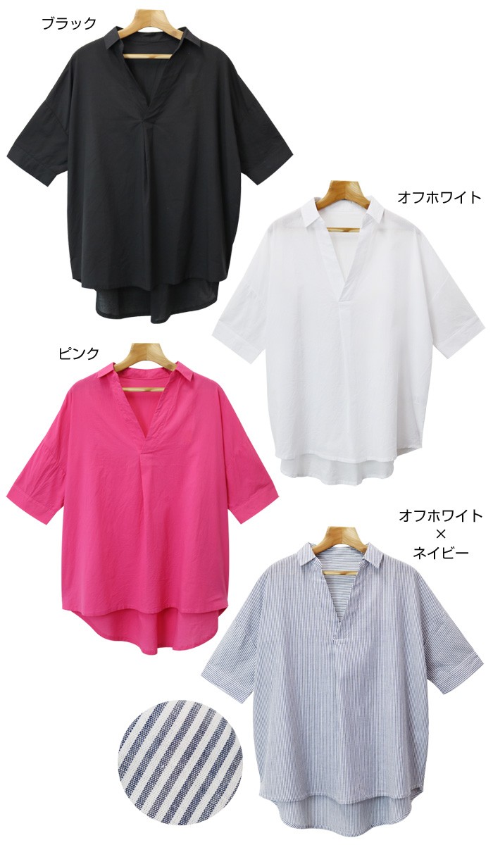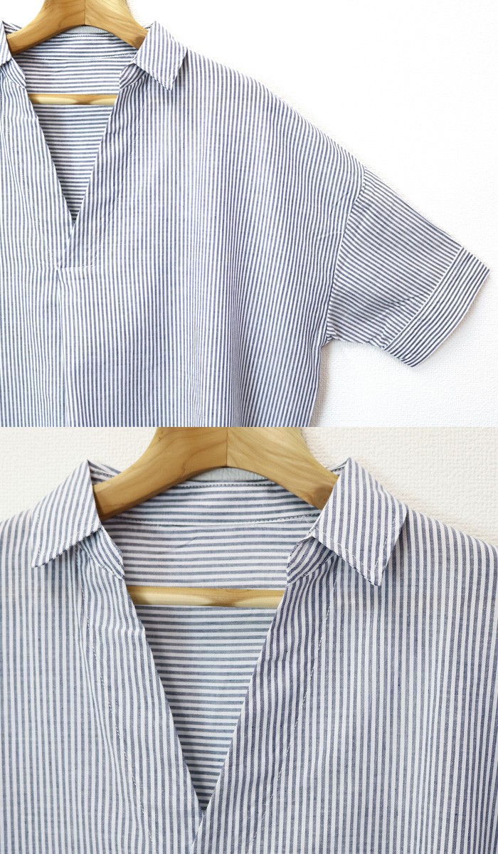 胸元はボタン無しのVネック→スキッパータイプで全体的にゆるっとしたビッグサイズに仕上げています。