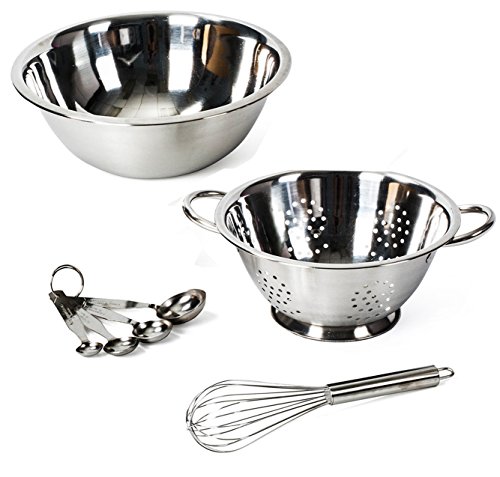 - Kitchen set includes 1 deep set stainless steel bowl, a colander, and a set of 4 stackable metal measuring spoons and whisk.
