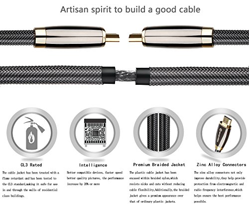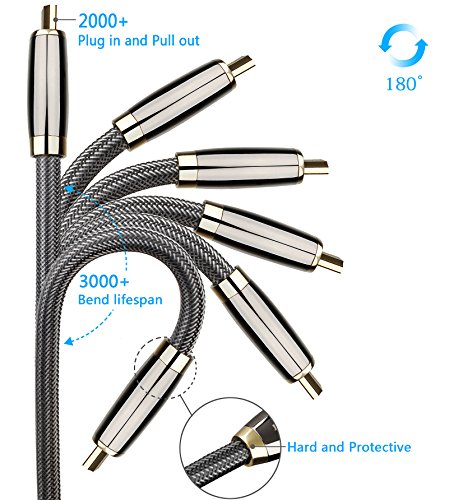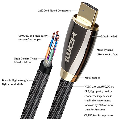 High-Speed HDMI Cable features 24K gold-plated, 99.996% and high purity oxygen-free copper, corrosion-resistant connectors that deliver optimal signal transfer with lower distortion at the point of contact. Ultra-high speed lossless audio and video transmission,This dedication to the digital signal provides sound and picture quality that is truer to the original. high quality PVC, Tough braided exterior outer layer and shielding, purity of the digital signal and longer service life.