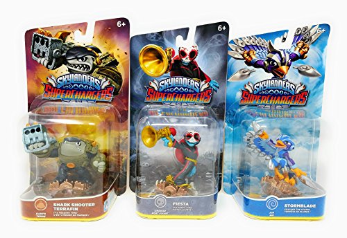 -. Feature : ONE: Skylanders Superchargers Stormblade Air / ONE: Skylanders SuperchargersShark Shooter Terrafin Earth / ONE: Skylander Superchargers Fiesta Undead / Skylanders Superchargers are perfect gift for Christmas, Birthdays or any occasion / Each Single Toy Pack includes: 1-Skylanders Vehicle and 1-Sticker Sheet