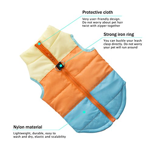 1.Material- Soft Polyester fabric material,keep your puppy warm and comfortable.Machine washable and tumble dry, easy to wear and clean 2.Very user-friendly design- Protective cloth. Do not worry about pet hair twist with zipper together 3.Strong iron ring- You can buckle your leash clasp directly. Do not worry your pet will run around 4.Fashionable- Cute and Adorable sleeveless winter Vest for your lovely sweet pet, make your pet become more attractive