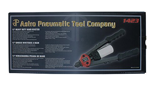 Heavy Duty 13" Hand Riveter; # Patented structure increases power and reduces shock # Shortest long arm riveter which can operate up to 1/4" (6.4mm) stainless steel rivets # Shorter handle with double compound hinges that maximize leverage # One of our most versatile and powerful hand riveters taking the hard work out of setting large diameter blind rivets # Ideal for working in hard-to-reach area # 3 piece jaws made of Cr-Mo steel provides long lasting tool life # A one-piece collet case eliminates the need to adjust the tool when changing rivet diameters # Includes 5 Nosepieces: 1/8" (3.2mm) 5/32" (4.0mm) 3/16" (4.8mm) and two pieces of 1/4" (6.4mm) # Ergonomic grip for easy operation # Core collection bottle for safety and ease of disposal # Weight: 2.5 lbs. (1.14kg)Feature