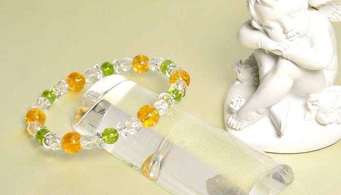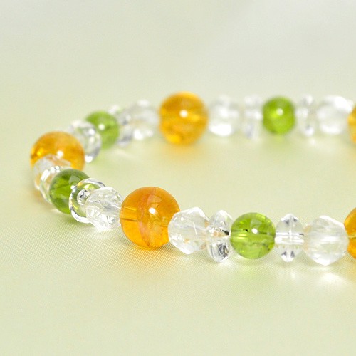 シトリン 8ミリ玉 ペリドット 6ミリ玉 カット水晶 6ミリ玉 平珠水晶 3×6ミリ *ゴムを使用しています。 |