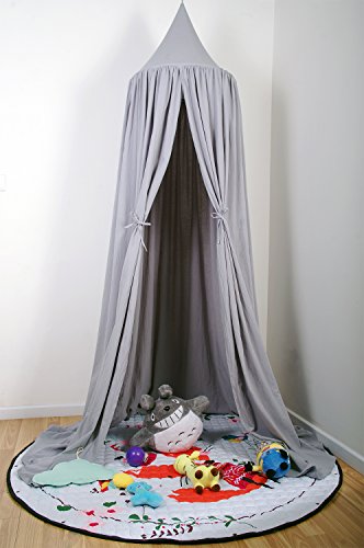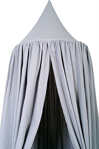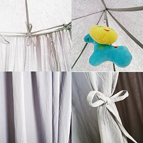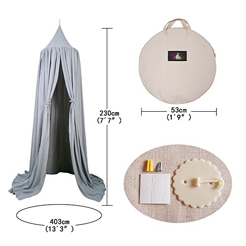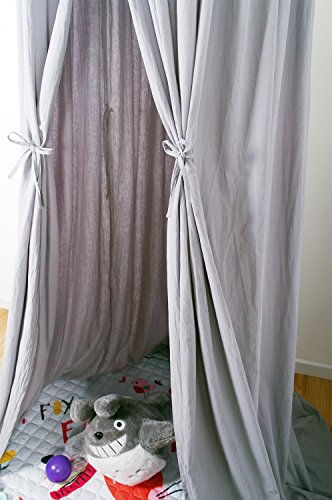 This quality 100% cotton fabric canopy is great either as a individual canopy for children's play use or for a baby crib. measuring 6'9" in height from the top tip draping down to the floor, a 19 1/2" (50cm) diameter 5 gauge (5mm) thick solid stainless ring on the top, and about 160 inch perimeter at the bottom. This canopy also have four pairs of string ties to tie up the canopy opening into two different opening positions. Inside at the top is a string loop for hanging decoration items or a lantern (not included).Feature