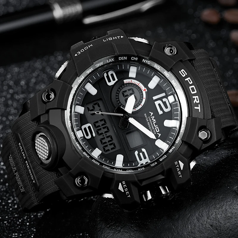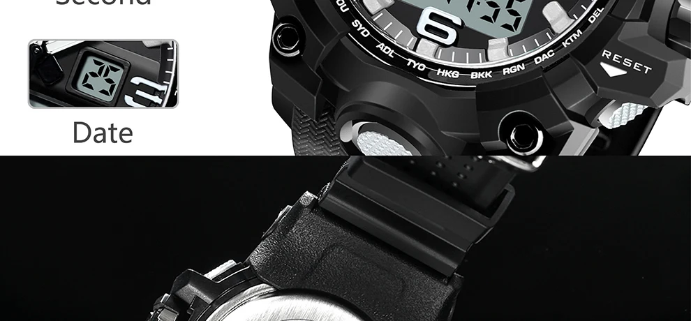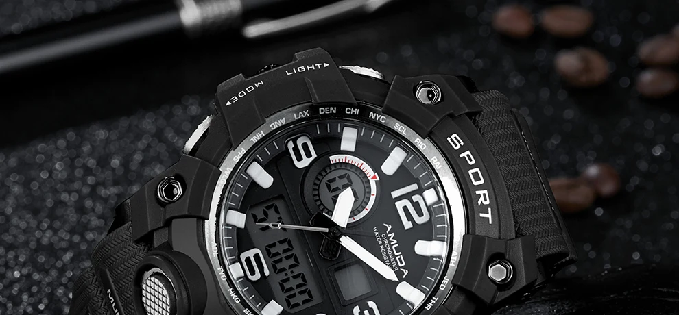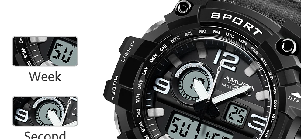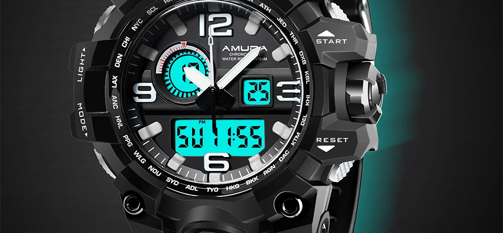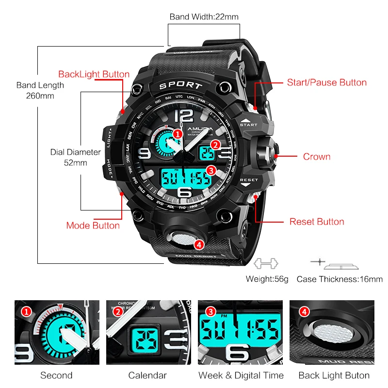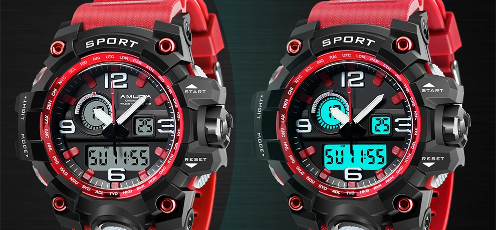 Feature:Complete Calendar,Shock Resistant,Week Display,Water Resistant,Back Light,Chronograph,Multiple Time Zone,LED display,Alarm