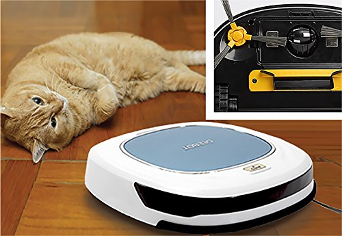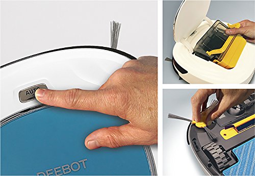 Welcome DEEBOT D45 to your family. This DEEBOT is a simple, effective, affordable hard floor cleaning robot. It is easy to operate and maintain, cleans effectively with no-tangle direct suction (great for picking up pet and human hair), has dual sweeper side brushes, a remote control and can dry mop! It also safely cleans up to and around stairs, easily fits under furniture to find dust bunnies, automatically detects obstacles in its path, and cleans once per day even if nobody is at home. When D45 runs low on battery, it will automatically recharge!Feature