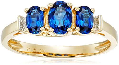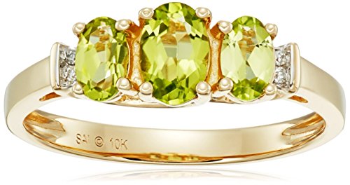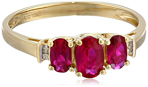 Celebrate her birthday with the colorful brilliance of this 3-stone birthstone ring. The top of a classic 10k yellow gold band holds three oval-shaped birthstones. The birthstones are accented along either side by round-shaped white diamond stones that create extra sparkle throughout the piece. The diamonds reveal I-J color and I2-I3 clarity. This is a classic gift that can be worn on all occasions and is sure to be enjoyed for years to come.Feature