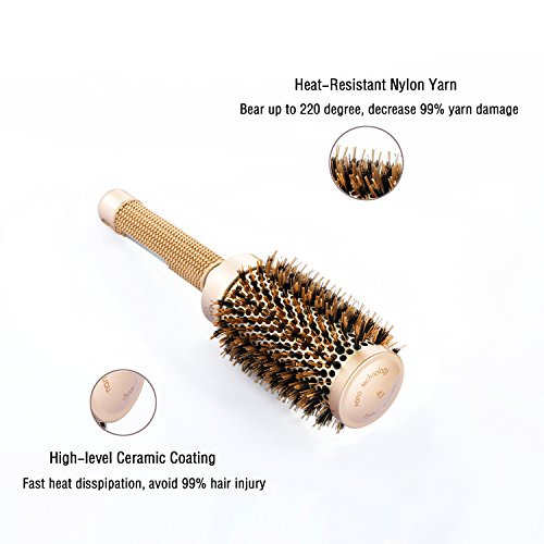 ROUND BARREL HAIR BRUSH WITH BOAR BRISTLE: Human scalp naturally produces oil called sebum which acts as a protector for hair. The boar bristles help to spread this sebum around to lubricate each of your hair strands which reduces frizz. For Smooth Finishing and Quick Drying. Enhances Shine with Natural Boar Bristles. Large round shape creates volume and curl shine with natural boar bristles. Anti-static, anti-bacterial. Highly heat resistant;