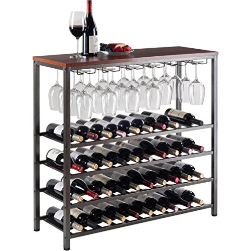 -. Feature : 40-bottle capacity. Assembly required / Product Dimensions 26.4"H x 14"W x 38"L / Room for 24 standard-size wine glasses. Antique bronze finish with walnut finish top
