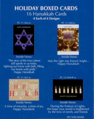 Product DescriptionBox of 16 Hanukkah Holiday Cards. assorted 4 designs - 4 of each0