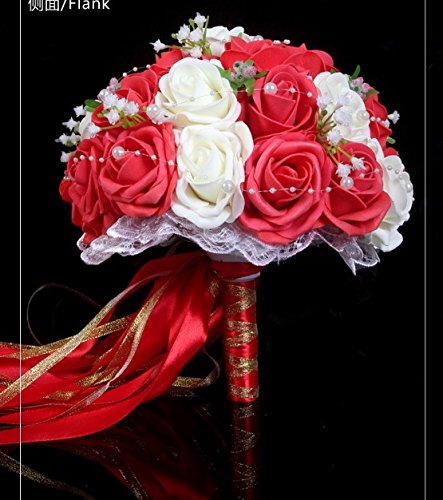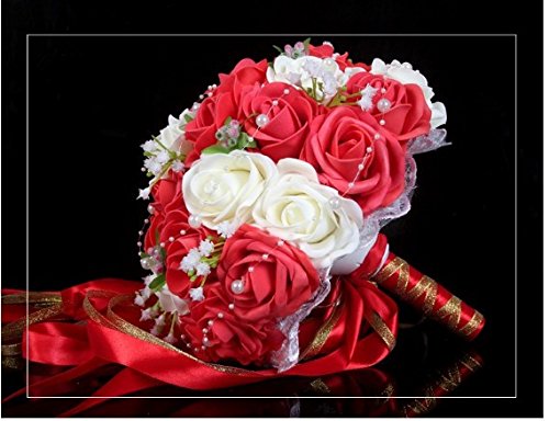 - Feature : Bridal Bouquet made with red and white Roses with Pearls Chain , Beautiful Ribbon / 30pcs Bridal Bouquet 24-26cm W 33cm H / Silk flowers won't wilt in the heat or freeze in the cold. The consummate choice for all weather conditions / You can use flowers that may normally be out of season and there are also a wide variety of colors, above and beyond the limitations of mother nature. / The silk flowers available to us today are so glamorous and realistic you will be amazed. We think that many of the flowers are even more vibrant and beautiful that their fresh counterparts.