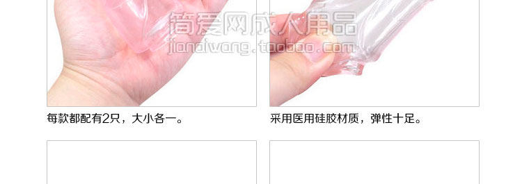 规格:2只装(一大一小)材质:高品质软胶,高弹性這粉紅透明附助套采用弹性软身物料制造,一套有两个大小供选择使用。可套于龟头使用,增加持久力,增大体积、增加刺激、快速高