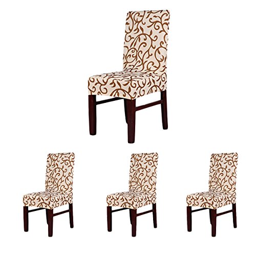 4 x Soft Fit Stretch Short Dining Room Chair Covers, Printed Pattern, Banquet Chair Seat Protector Slipcover for Party Hotel Wedding Ceremony (ChampagneCoffee)