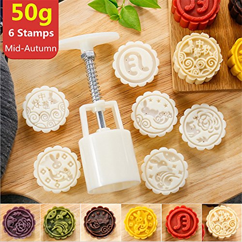Mooncake Mold With 6 Stamps - Mid Autumn Festival Moon Cake Mold DIY Decoration Cookie Press 50g White (1 Mold 6 Stamps)