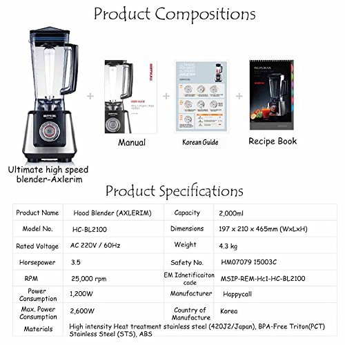 Happycall Ultimate High Speed Blener AXLERIM HC-BL2100 (HC-BL2000 New Ver.) Hood Mixer 2000ml 220V +
