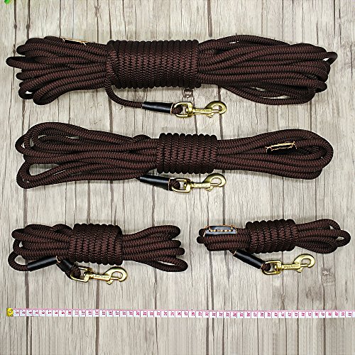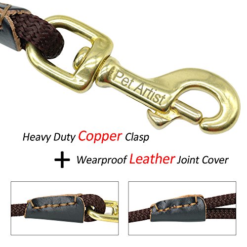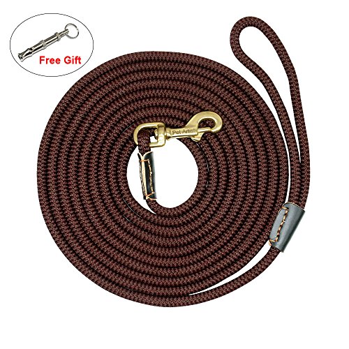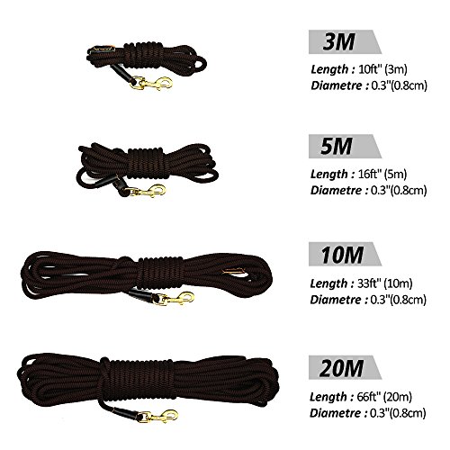 Pet Artist is prefessional dog supplies brand with more than 8 years experience in this field, especially good at dog training products, we aim at your great buying and using experience Various Sizes - 3/8inch diameter, length:10ft(3m),16ft(5m),33ft(10m),66ft(20m), 4 sizes fit for different training purposes and perfect dog control; Light Weight - The leash is very lightweight. Less than 33g/m, the longest size lead weight is just approx 1.5Ibs. It`s easy to carry so you don`t have to carry a heavy tracking leash while training; Heavy Duty - The leash can bear 180Ibs pull, the copper hook/clasp perfect for holding less than 100Ibs dog, such as German shepherd, Labrador, Golden retriever and smaller dogs breeds,etc; Wearproof Anti-rust - The outer layer of the leash is made of special braided nylon which is very wearproof and anti-slip than common rope lead, also the copper clasp/hook is anti-rust, the joints of leash and clasp with genuine leather cover to anti-wear , which make the leash durable and for long time using even in bad training/tracking environment; Easy to Clean and Store - The whole leash is washable better be dried by wind, the clasp/hook is anti-rust, so the leashs is perfect for using on the beach, outdoor adventure, etc;