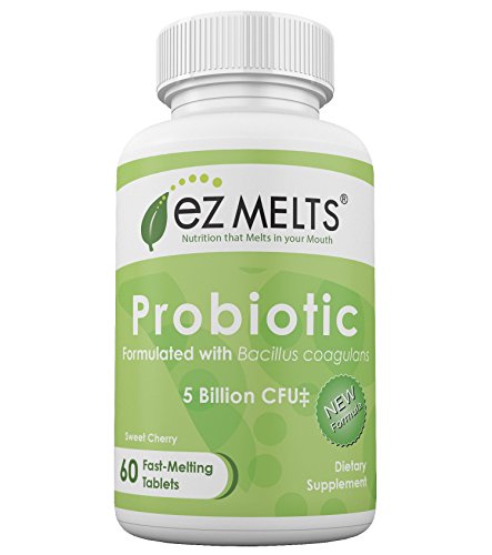 -. Title : EZ Melts Probiotic with Bacillus Coagulans, 5 Billion CFU, Dissolving Vitamins, Zero Sugar, Natural Cherry Flavor, GMO-Free Fast Melting Tablets, Digestive Health, Gluten-Free Chewable Supplement