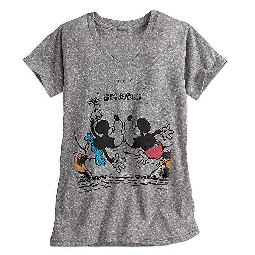 Timeless twosome Mickey and Minnie show their magnetic attraction in a vintage-look vignette on this slubbed v-neck tee for flirty fashionistas everywhere!