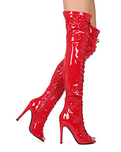 Product Description These sexy OTK are made with a vegan upper, peep toe and lace up front. Also made with a single sole, stiletto heel and side zip for easy slip on and off. 0