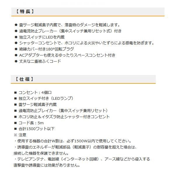 雷ガード機能がついた電源タップです。シャッターコンセント式でホコリによる火災やいたずらによる感電も防止します。