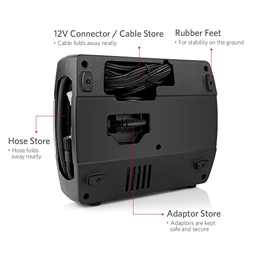 VERSATILE- Nozzle*1pcs and ball pin*1pcs, power cord 3m and air hose 0.5m(almost 12 feet), flexible enough to cater on all tires in your car. Premium quality power adapter that plugs directly into any 12-volt DC accessory outlet provide easy access to almost all types of tires: car, bike, motorcycle, RV, SUV, ATV and truck, also sports equipment and inflatables.