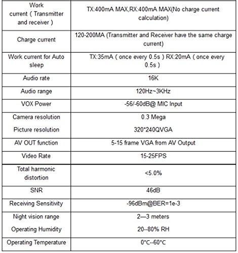 -. Feature : 1. Adopt 2.4GHz Frenquency transmission,accord with FCC,CE Standard; / 2. Support one receiver can connect 4 transmitters;Long-distance transmission:Up to 200-300m in open air; / 3. Have operation text menu display function; / 4. Day and night monitoring with clear images for 24 hours;With high resolution 2.4" LCD display screen; / 5. Half-duplex Voice Transmission,Voice clear, volume of sound (0~10) is adjustable;