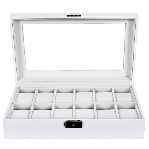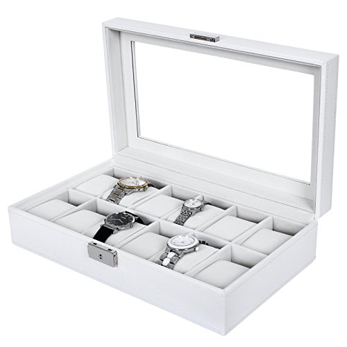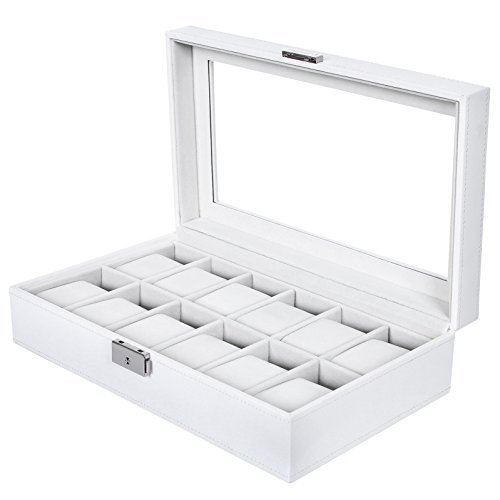 SONGMICS 12 Mens Watch Box Glass Top White Display Case Faux Leather Organizer UJWB202