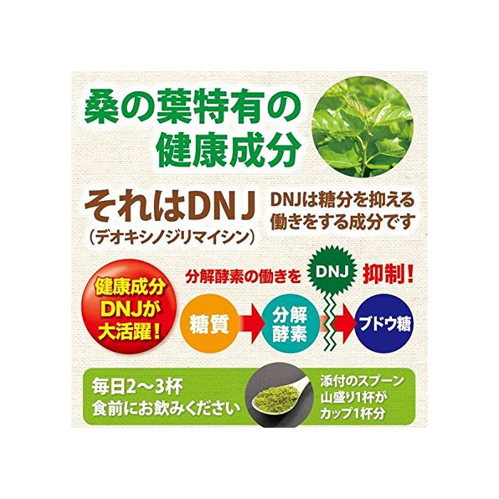 「무심코(그만) 달콤한 물건을 과식하는 분(쪽,편)에!」뽕나무의잎에는 당분의 흡수를 억제하는 성분(DNJ)가 포함되어 있습니다.