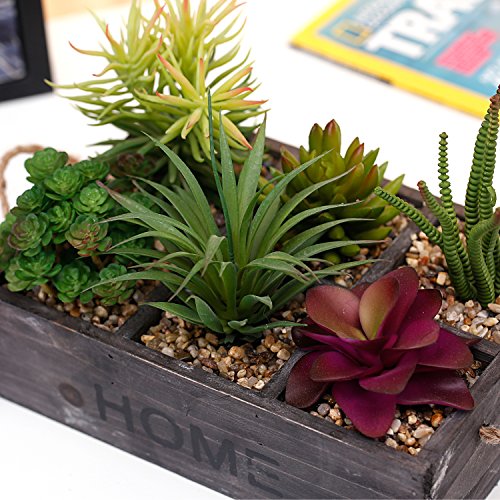 Potted Artificial Succulent Plants in Rustic Wooden 'HOME' Planter Box with Rope Handles