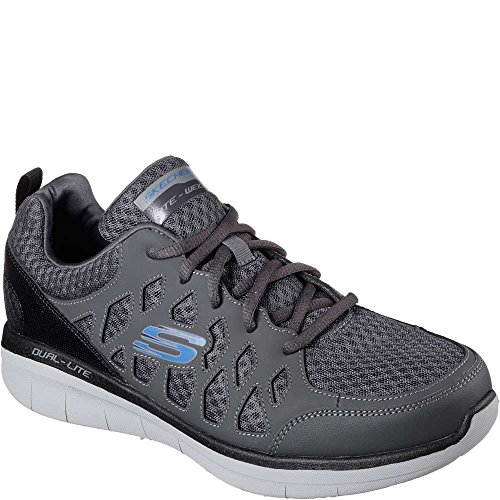 Binding : Apparel Product Description SKECHERS Men's Synergy 2_0 Peslier cross-trainer shoes feature a smooth action leather synthetic and mesh upper. Smooth synthetic overlays for added durability. Lace-up front for a secure fit. Smooth synthetic side and heel overlays. Soft fabric collar and tongue trim. Wraparound synthetic heel panel for added stability. Soft fabric shoe lining. Air Cooled Memory Foam cushioned comfort insole. Shock absorbing Dual-Lite® lightweight midsole for added comfort and range of motion. Rubber traction outsole. 0