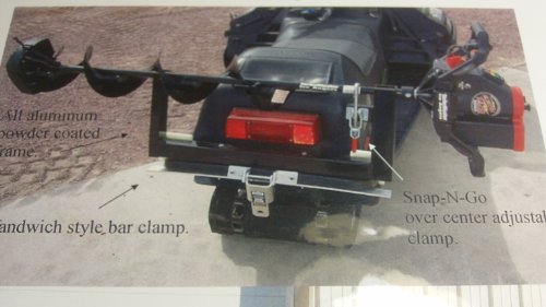 Studio : Digger Anchor Publisher : Digger Anchor Binding : Misc. Product Description This Ice Auger Carrier features a universal mount style that works with any kind of vehicle. The "Standard Mount" is a sandwich style mount that works on any ATV rack or Snowmobile bumber. (For Polaris ATV composite rack or Polaris UTV you will need to select the correct mount style. See above)..... The mount is constructed from high grade aluminum alloy that resists low temperatures..... Scratch Resistant:The platforms are scratch resistant to eliminate wear and on your ice auger....Fast, secure over center shaft clamp: The quick ready and go design with adjustable snap-n-go clamp helps in securing your ice auger over the center in less seconds. Works for: Jiffy, Strike Master, Eskimo Ion, and more!... The auger lays in the grooves machined in the two uprights on the main frame and is held securely in place with our exclusive Snap-N-Go over center clamp. The clamping pressure can be easily adjusted for various size auger shafts. This Ice Auger Carrier is proudly Made In the USA 0