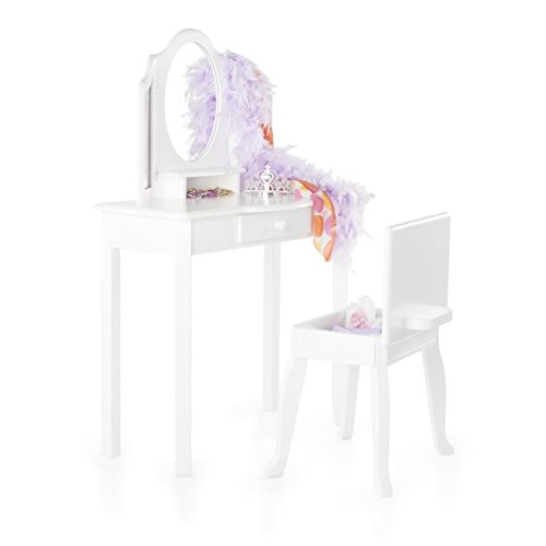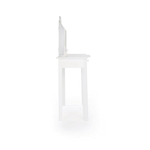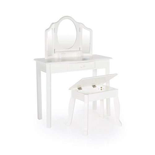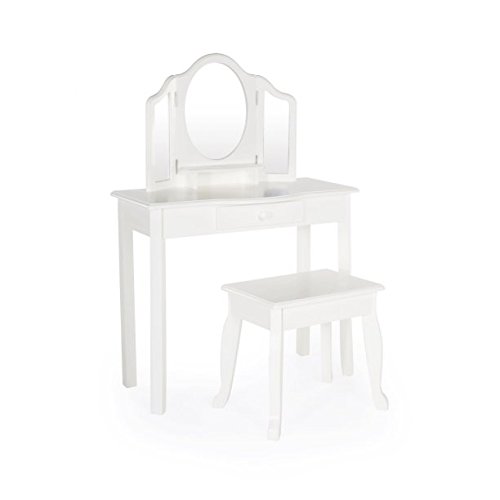 Studio : GAShop Publisher : GAShop Product Description With this two-piece vanity and stool set, your little girl can keep her brushes, jewelry, and pretend-play make-up ready for dress-up and everyday occasions! Features a 3-section mirror with gently scalloped silhouettes and handsome edge routes for a timeless look. Single storage drawer and under-mirror shelf offers convenient space to keep accessories and playthings, while stool seat flips-up to reveal additional storage space. Furniture-grade construction makes this a childhood essential.Adult assembly required. Ages 2 . Vanity: 28"W x 13"D x 42"H Stool: 16"W x 13"D x 15"H. Two-piece vanity and stool set offers the perfect spot for dress up and pretend play, Classic Vanity and Stool - White 0