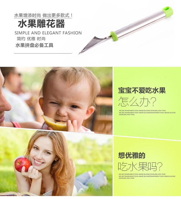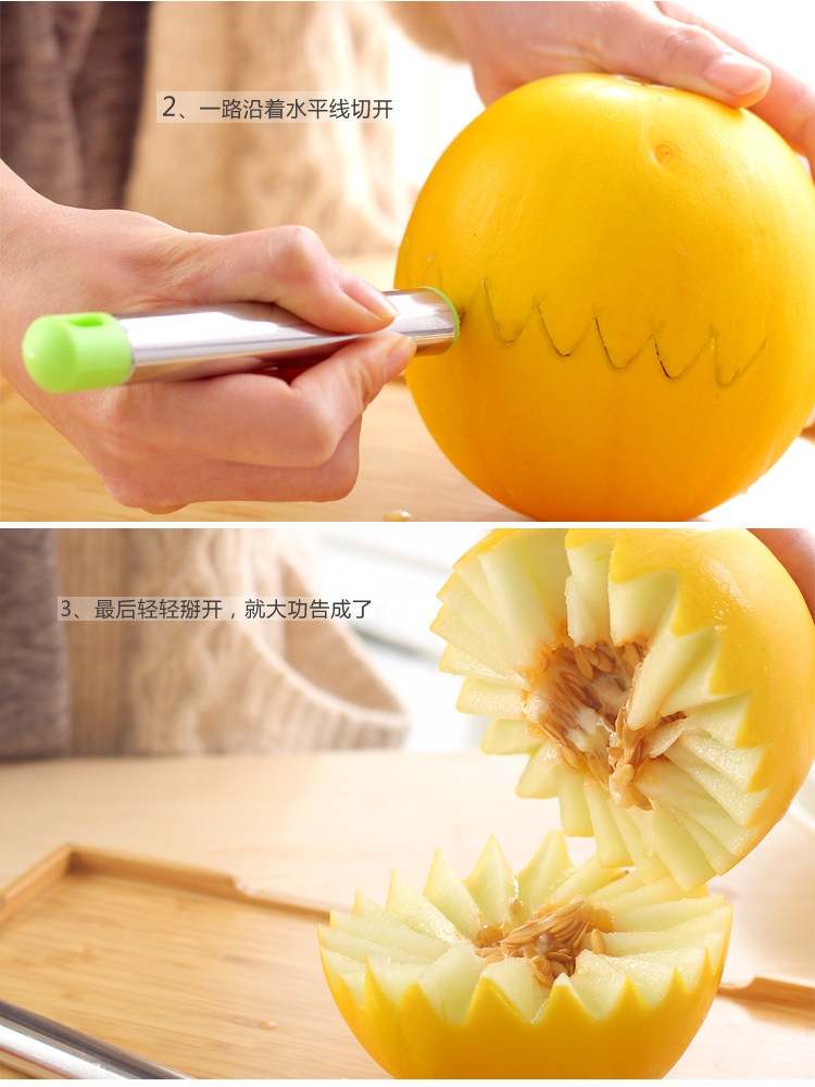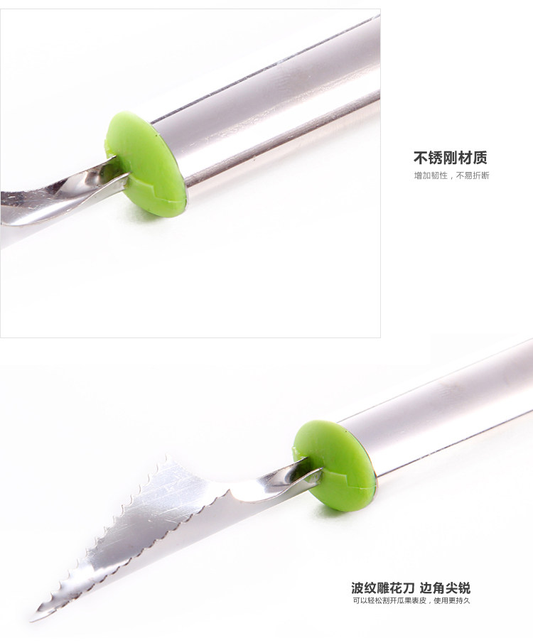 介绍:采用食品级不锈钢精制而成,抗菌、防锈,抗腐蚀、     易清洗,波纹雕花刀,刀刃尖锐锋利。可以轻松切割花式水果,是您居家制作水果拼盘、蛋糕装饰的好帮手