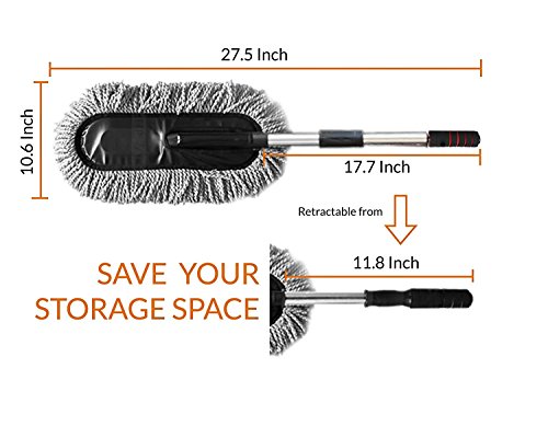 EXCELLENT DESIGN EASY MAINTAIN --- The overall length is 27.5", and the duster part is 15.7"; perfect to reach sufficient surface area. The stainless steel handle is long, comfy to grip, and retractable from 17.7" to 11.8" to save storage space. Simple and easy maintenance, just give it a good shake occasionally to get rid of the excess dust.