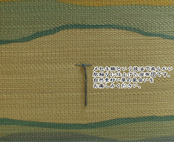 職人が1枚1枚手作業で捺染プリントを施したイ草座布団です。メセキ織という技法で柔らかい肌感触に仕上げました。またイ草の生地を縫製した後に、生地を湿らせ、裏返しにする『返し』という技法で仕上げております。イ草を通常曲げてはいけない方向に曲げますので、良い(太く強い)イ草でなければ作ることができません。返すことにより、ふっくらしたボリューム感を出しました。国産(九州産)のい草を使用しています。一本一本が太く、表皮が厚く繊維がキメ細かいので弾力性があり、耐久性に優れています。い草には空気の自然浄化作用、湿度の調節作用などがあります。また汚れにくく、使用するうちに黄金色に変化し味が出ます。い草に青森ヒバ加工を施しています(抗菌、防臭効果)。中材はウレタンをフェルトでサンドした三層構造で、適度なクッション性があります。※柄のプリントは職人が手作業で描く為、同じ色・柄であっても多少風合いが異なります。