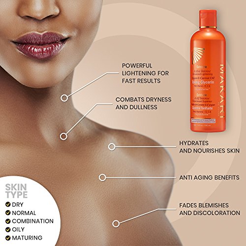 Take luxury skin care to the extreme. For years, women of color have sought high-end skincare products designed exclusively for their unique concerns. Finally, with the Extreme collection by Makari, everyone can achieve the clear, smooth, glowing complexion they've always dreamed of. Specially formulated for all skin types, our rejuvenating Extreme Carrot & Argan Oil Toning Glycerin is enriched with OrganiclarineTM, a naturally derived active whitening agent. Regularly massage this moisture-rich humectant onto your body, and watch as dark spots, acne blemishes, scars, and hyperpigmentation fade away for a fresh, youthful, perfectly even appearance. Infused with antioxidant-rich vitamins C and E, it also softens uneven texture and tightens saggy skin for maximum anti-aging effects. Use routinely with Makari's complete line of Extreme lightening products to achieve your ideal shade of beautiful!