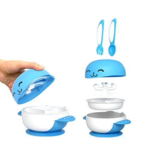 Baby Toddler Training Slip-resistance Sucker Bowl with Lid Spoon Fork Spoon Rest Seperate plate,Infant Spill Proof Feeding Tableware 6 set (Blue)