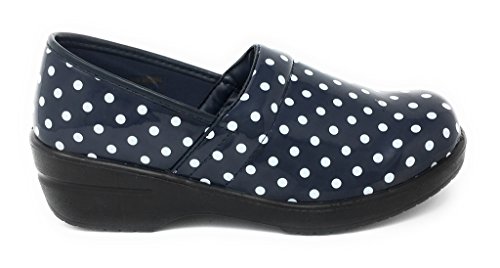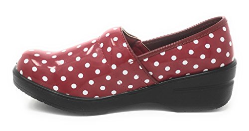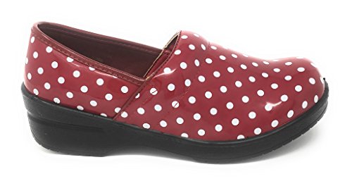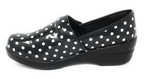 Product Description Sophisticated polka dots add a touch of flair. Slip resistant soles for safety; lightweight and padded for comfort; glossy finish is easy to wipe clean. 1.5 inch heel 0