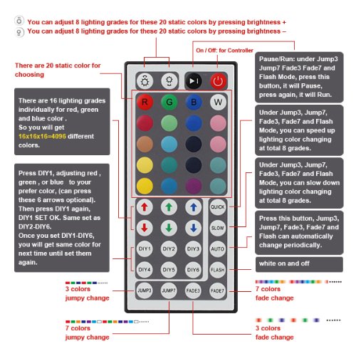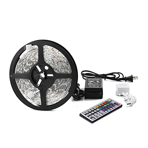 Led strip light has 300 waterproof 5050 RGB Leds in 16.4ft with dimming and brightness controls This led Light strip kit can be cut to every 3 leds, 3M adhesive tape on any dry and flat surface These decorative lighting is twice as bright as LED rope lighting and led string lights. With these Novelty lighting you can Lighting up your Party such as Weddings, Birthday Party, School Party, Dancing Party etc. With these Indoor lighting and Outdoor lighting you can decorate your patio, garden, your home and kitchen ,TV, Studio, vehicle etc. These waterproof led strip light can stay outdoors on a rainy day(protecting your adapter with a plastic cover), pop up the clubs, bars, shops, hotels, restaurants, casino. This seasonal lighting is handy for holidays, such as Christmas, Thanksgiving Day, Saint Valentine Day, Halloween etc. Remarks: Connect the load and power lines, make sure all connection right before power switched on; Insure there is no obstacle between the IR controller and the receiver when operating; Take off the plastic sheet of remotes battery before using.Feature