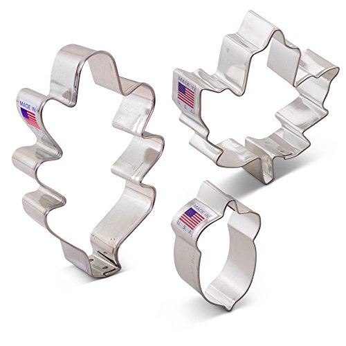 AUTUMN / FALL / THANKSGIVING COOKIE CUTTER SET - Enhance any autumnal festivities- especially those that include leaf peeper friends- with the 3 7/8" Oak Leaf Cookie Cutter, the 3 1/8" Maple Leaf and our 2 1/2" Acorn Cookie Cutter. Perfect for a total Fall foliage theme.