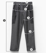 | 尺码 | ①裤长 | ②腰围 | ③臀围 | ④大腿围 | ⑤膝围 | ⑥脚围 | ⑦前裆 | ⑧后裆 | ||