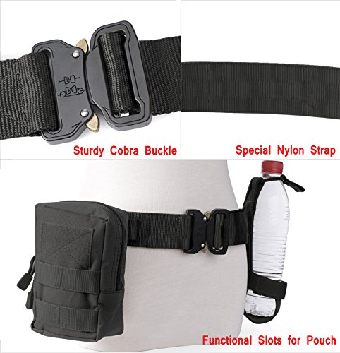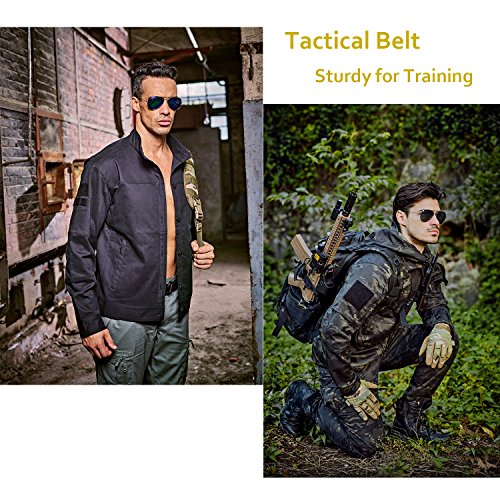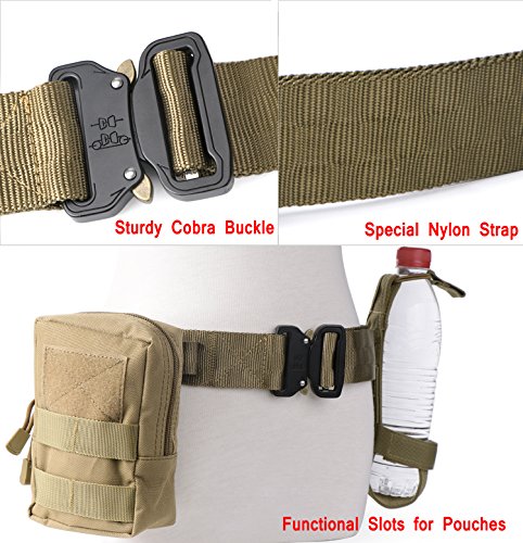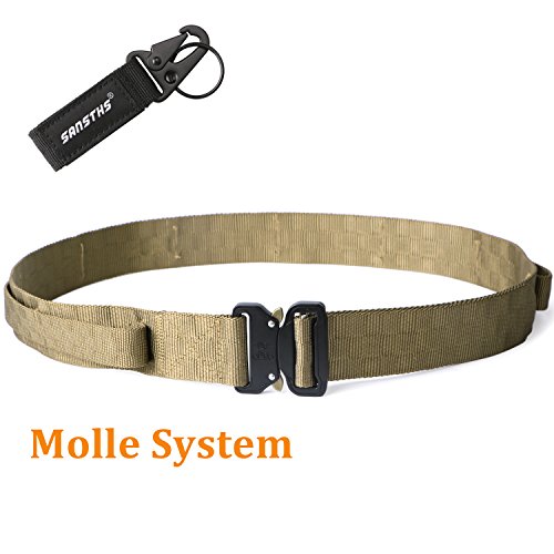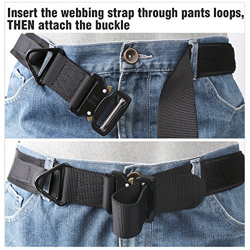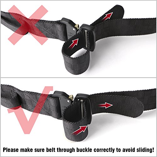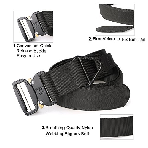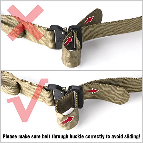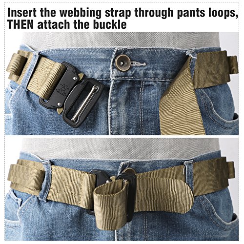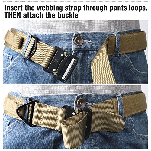 Binding : Apparel Product Description 1. Great Quality Gun Belt: Metal Buckle is built to last that tough enough for Police, Firemen, Army, Search, Rescue, campers, hunters, explorers, and other outdoor activities. Practical Triangle Ring can carry heavier things than military nylon clip. The Eco-friendly Nylon Strap is breathing, comfortable and quick dry. 2. Men Combat Duty Belt: Our no holes army belt is adjustable and the 1.3 inch width Velcro can help you attach the belt strap avoiding belt sliding. And the Triangle Ring can be fixed by Velcro when not in use. 3. Quick Style Durable Belt: This quick release buckle is easy to use. Pushing the golden tabs down at the same time to release the buckle and attach to re-lock. It is convenient when in emergencies. 4. Many Uses Outdoor Belt: Tactical belt fits for Dockers Cargo Pants, CQR Men's Tactical Pants, Wrangler Classic Twill Pants, Match Casual Jeans.