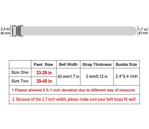 Tactical Belt Size Chart: Size One: 33-38 inch waist(Adjustable) Size Two: 39-44 inch waist(Adjustable) These Sizes are Strap lengths, please allowed 0.5-1 inch deviation due to different way of measure.