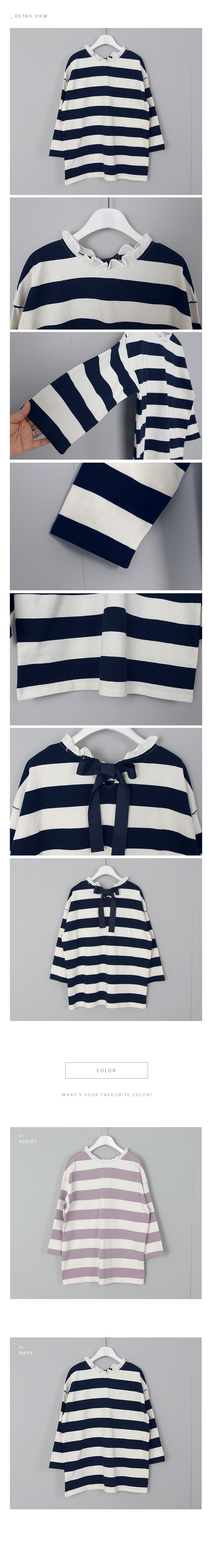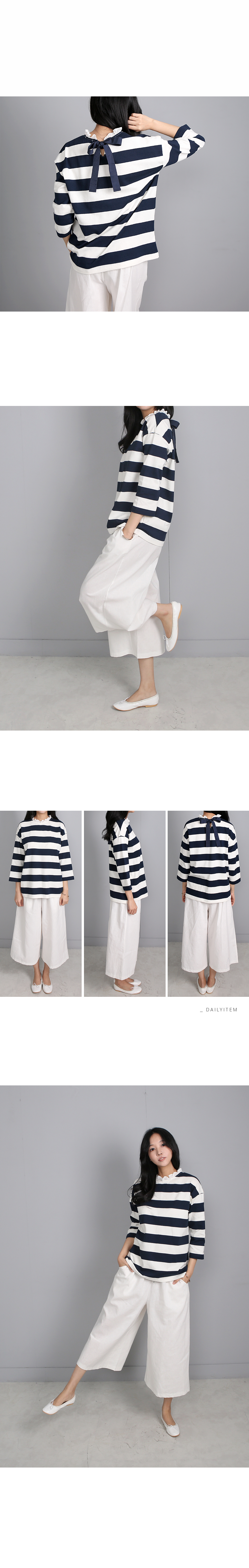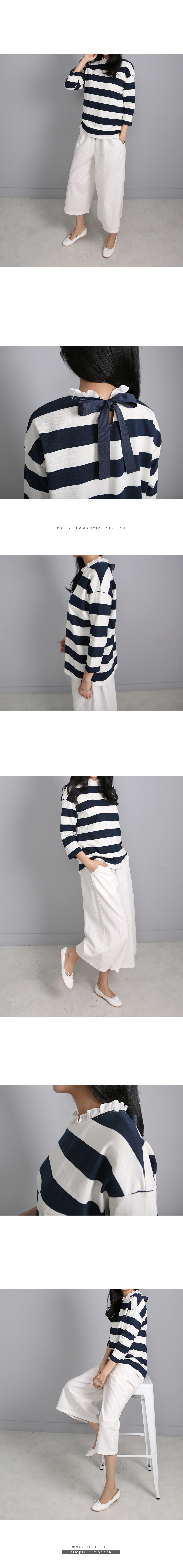 톡톡한 코튼 100%의 소재는 여름시즌에 맞게가볍게 가공되어 초여름까지 멋스럽게 입기 좋아요목선의 얇은 코튼으로 프릴이 덧대어져 있고뒷목에서 리본으로 클로징해요넉넉한 핏과 힙을 살짝 덮는 길이감으로루즈한 팬츠와 편안하게 매칭하기 좋은 아이템이랍니다프릴과 스트라이프, 리본의 조합이 특별한 티셔츠에요소재는 코튼100%색상은 바이올렛, 네이비사이즈는 FREE 44~66반▼ 관련상품 : 시크 린넨 와이드 팬츠