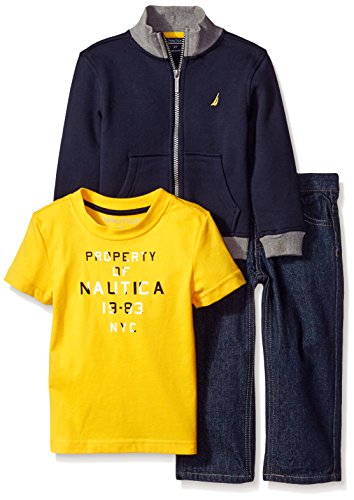 Nautica three piece fleece set with convertible collar jacket, short sleeve tee, and denim pants.